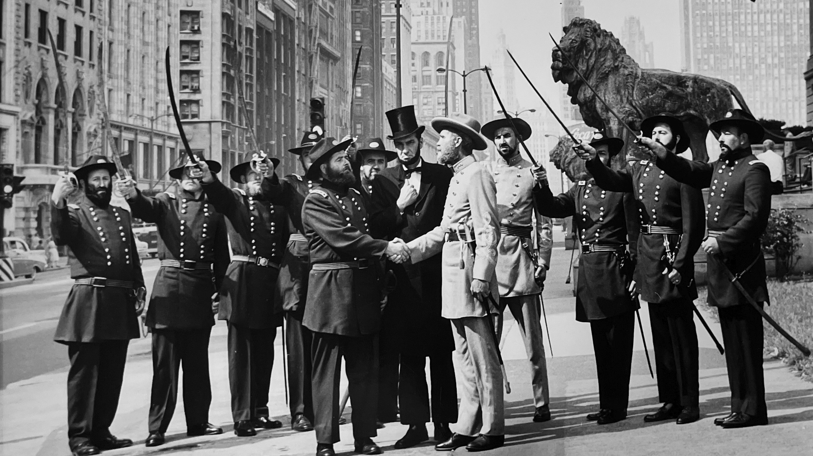 This original group travelled and took part in many Celebrations; the most known was the Chicago Music Festival, held in Soldier's Field. Grant and Lee shook hands, while Lincoln looked on.