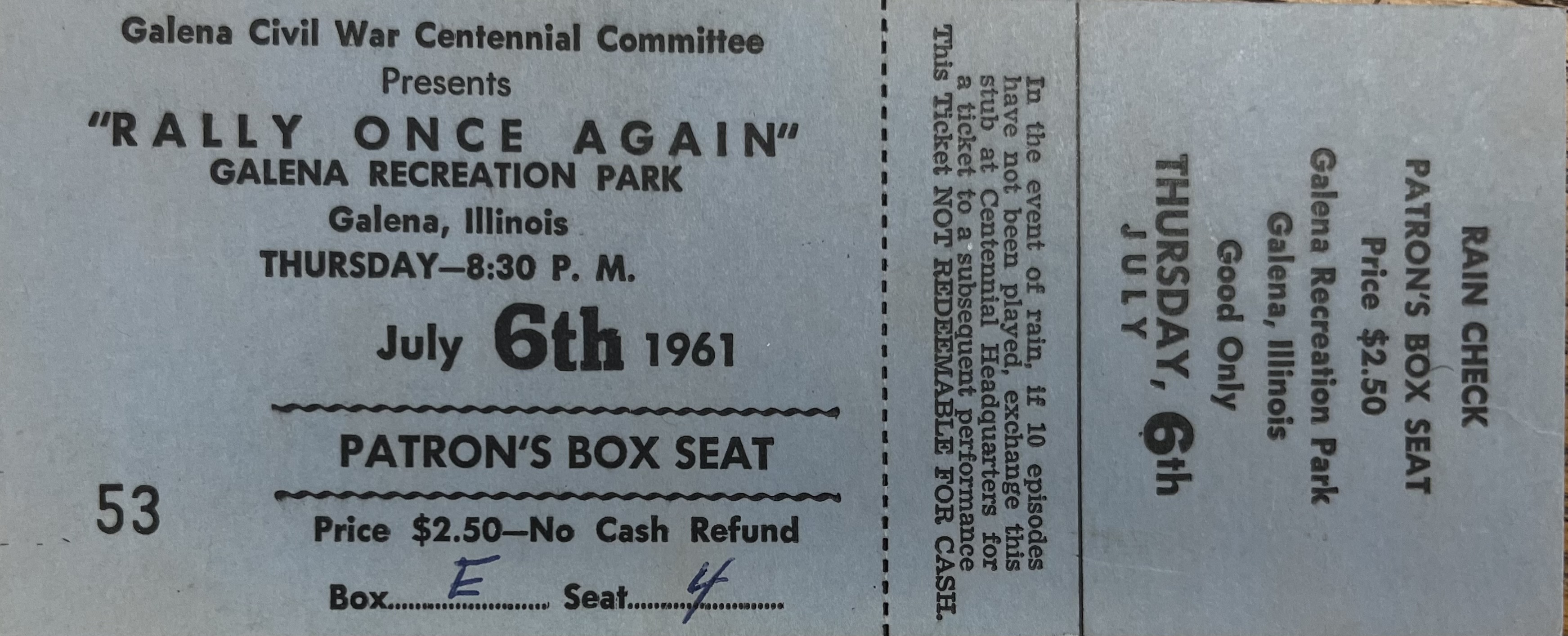 In 1961, 100 years after the start of the Civil War. The City of Galena celebrated, with "Rally Once Again", the Civil War Centennial.