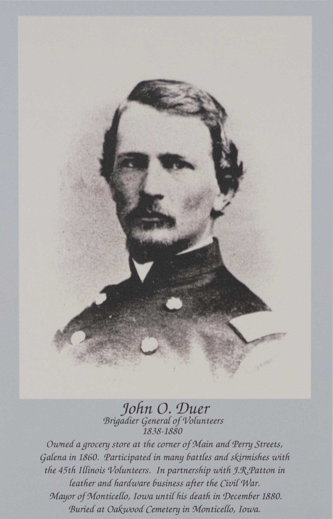 Brevet Brigadier General John Oliver Duer was born in Baltimore, Maryland on February 12, 1838. Duer moved to Galena, in late 1860, with his brother, Charles, and opened Charles Duer & Brother Groceries and Provisions. The store was located on the corner of Main and Perry Streets. (200-202 North Main St.)